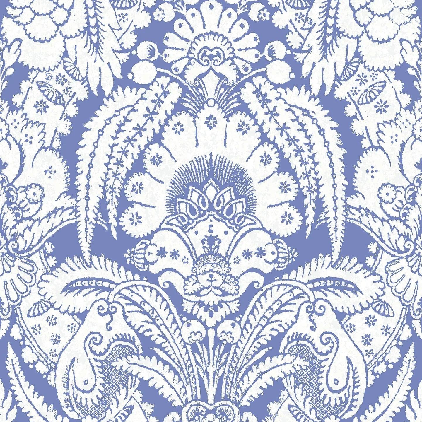 Behang met plantenmotief en ornamenten ALBEMARLE - Chatterton wit op blauw