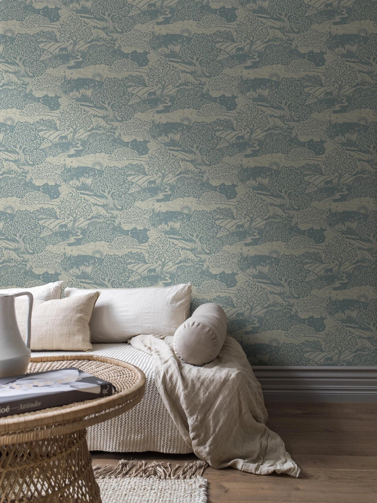 Behang Solängen is een majestueus patroon dat ons meeneemt naar een schilderachtig Noord-Europees landschap, vol rust en natuurlijke schoonheid. De kleurstelling brengt een sfeer van kalmte en harmonie in de ruimte. Het complexe patroon toont een landschap met golvende tarwevelden, weiden, bomen, paarden die grazen op zonnige heuvels en konijnen die zich verstoppen in het hoge gras, waardoor elementen van de natuur en rust in elk interieur worden gebracht.