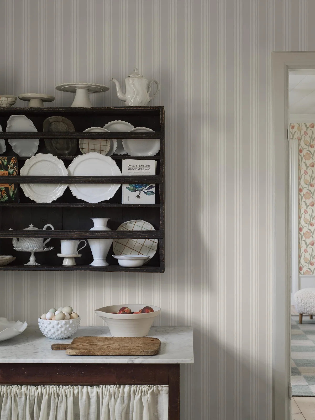 Behang Gunnebo is een elegante keuze die klassieke charme in Gustaviaanse stijl in uw interieur brengt. De delicate crèmekleurige strepen op de achtergrond van een subtiel patroon doen denken aan de schoonheid van het 18e-eeuwse Zweedse landhuis Gunnebo, waar dit patroon zijn oorsprong heeft. Het eenvoudige, maar verfijnde ontwerp creëert een sfeer van rust en harmonie.