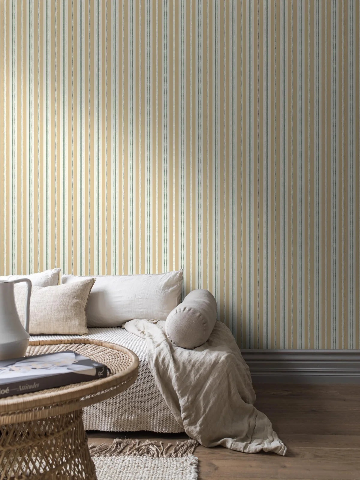 Behang Hedda is een klassiek streepmotief dat lichtheid en frisheid in uw interieur brengt, geïnspireerd door natuurlijk licht. De subtiele compositie, gebaseerd op delicate lijnen, creëert een harmonieuze en georganiseerde ruimte, terwijl het decoratieve accent een moderne uitstraling aan het geheel geeft. Het patroon combineert tijdloze esthetiek met een vleugje hedendaagse vrijheid, waardoor het perfect past in verschillende inrichtingen.
