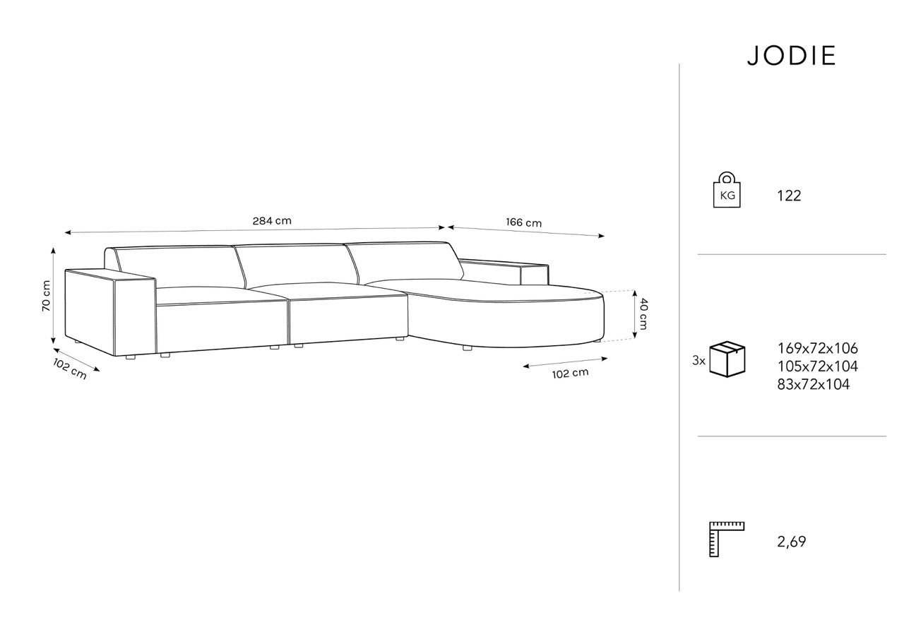 De zitting van de bank is gemaakt van fluwelen stof, die niet alleen comfort garandeert, maar ook duurzaamheid en weerstand tegen beschadigingen. De Jodie bank is ook zeer praktisch - u kunt deze bestellen met een optie voor de linker of rechterzijde, afhankelijk van uw behoeften.
