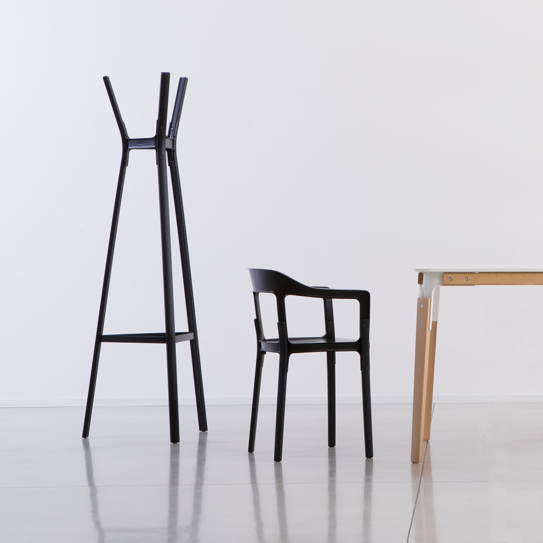 Steelwood to elegancki i minimalistyczny wieszak podłogowy zaprojektowany przez duet Ronan & Erwan Bouroullec. Połączenie ciepłego drewna z malowaną stalą nadaje projektowi nowoczesny, a zarazem ponadczasowy charakter. Konstrukcja opiera się na trzech smukłych nogach, które subtelnie rozszerzają się ku górze, tworząc stabilne i funkcjonalne miejsce do zawieszania płaszczy, kurtek czy toreb. Całość sprawia lekkie wrażenie, doskonale komponując się z przestrzeniami domowymi, biurowymi czy hotelowymi.