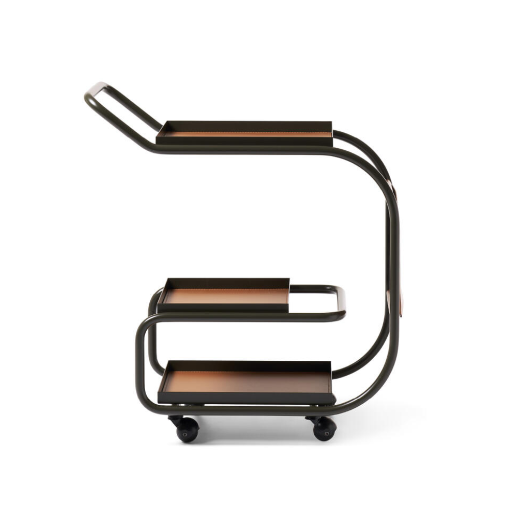 Zenzero is een design bartrolley die verrast met functionaliteit en verfijnde vorm. Het ontwerp van Samer Alameen combineert een moderne stalen constructie met drie praktische dienbladen – twee daarvan zijn uitneembaar – en een ruime zak van gerecycled leer. Draaiwielen en een ergonomisch handvat zorgen ervoor dat het meubel volledig mobiel is en klaar om u in elke ruimte te vergezellen – van de keuken tot de woonkamer, van het kantoor tot een exclusieve lounge.