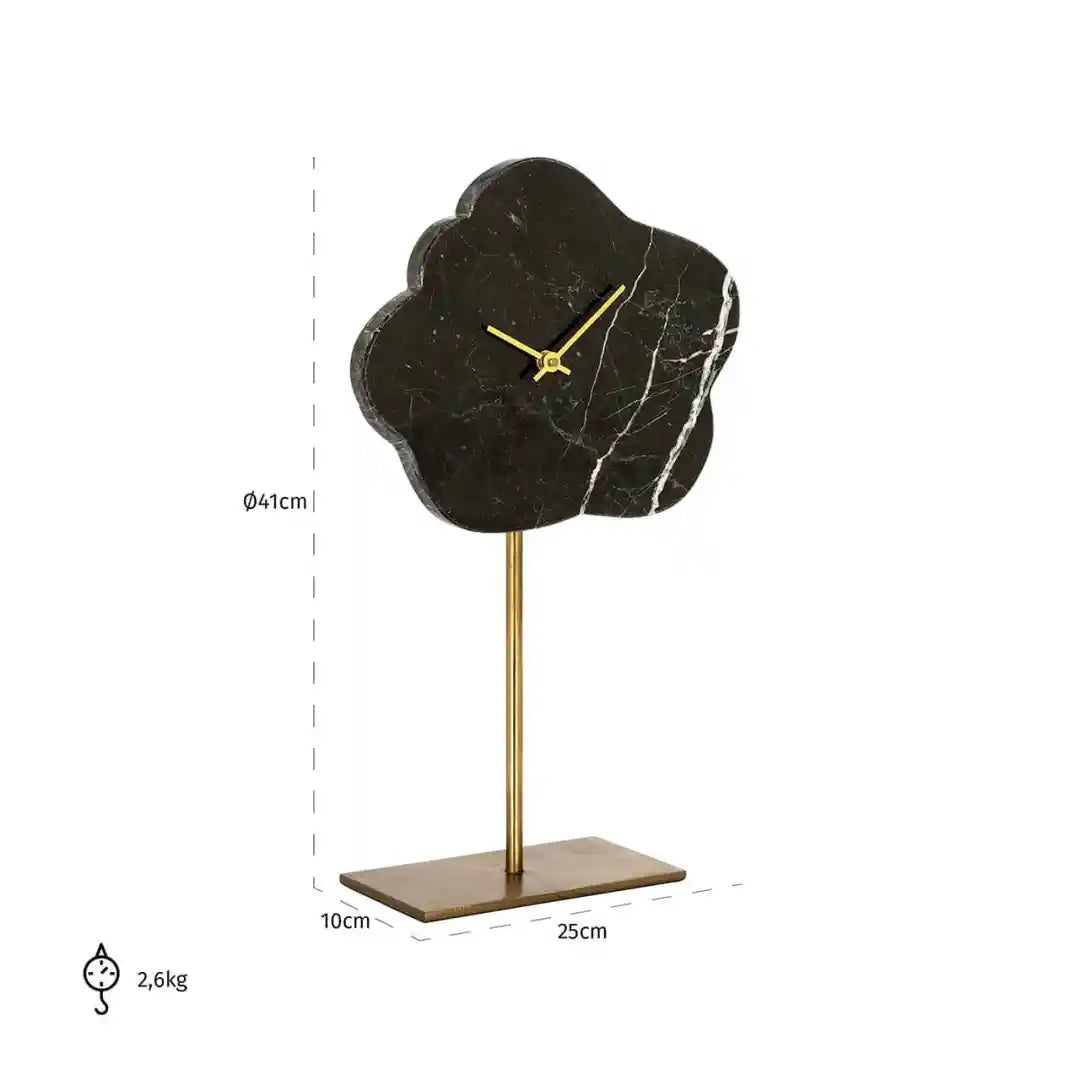 Designer staande klok Bram in zwart-goud is een unieke decoratie die functionaliteit met elegantie verbindt. De originele wijzerplaat in de vorm van een wolk, gemaakt van marmer, trekt de aandacht en voegt een onmiskenbaar karakter toe aan het interieur. De slanke, gouden voet geeft het een lichte en moderne stijl, waardoor het perfect past in glamour, moderne of eclectische inrichtingen.