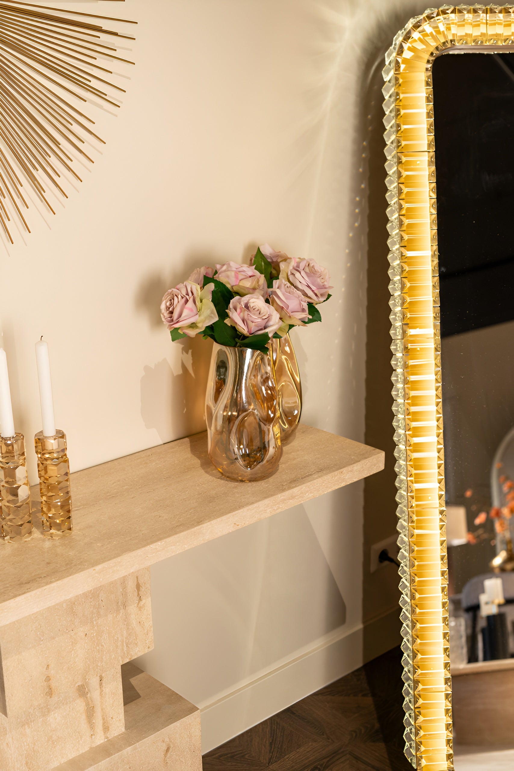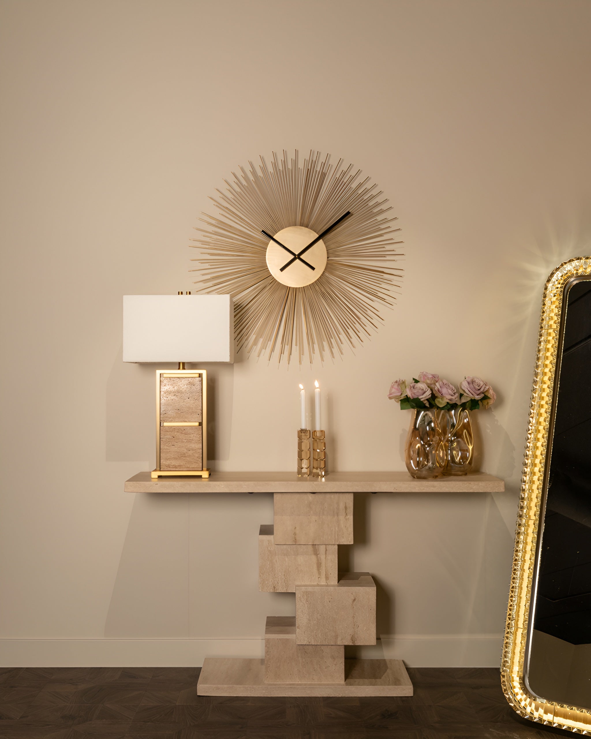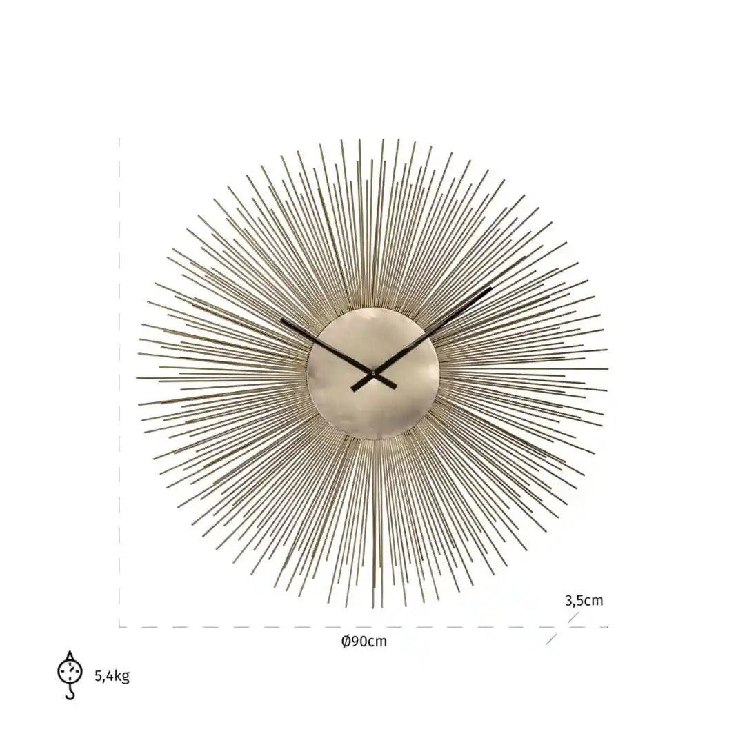 Wandklok Chasin in de vorm van de zon is een unieke decoratie die een onmiskenbare glans aan uw interieur geeft. De stralende constructie in gouden kleur creëert een driedimensionaal effect, waardoor de klok het middelpunt van de inrichting wordt. Slanke, zwarte wijzers contrasteren met de achtergrond en zorgen voor elegantie en functionaliteit in één.