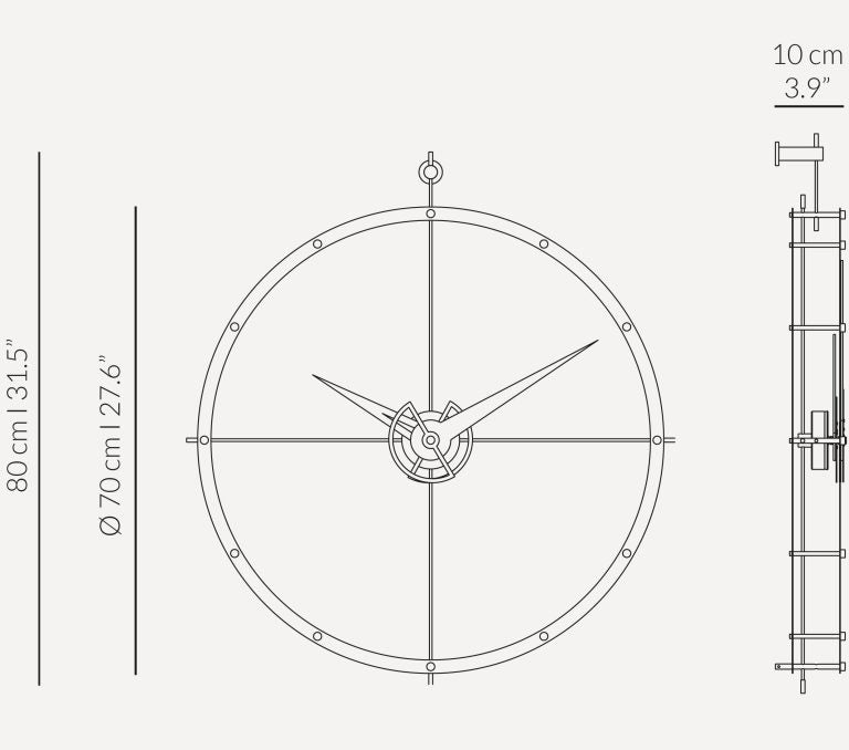 Het model is beschikbaar in verschillende afwerkingsvarianten: Doble O en (verchroomd messing en roestvrij staal), Doble O G (gepolijst messing en roestvrij staal), Doble O N (verchroomd messing en notenhout in calabo-afwerking) en Doble O NG (gepolijst messing en notenhout in calabo-afwerking). Het precieze Duitse UTS-mechanisme garandeert betrouwbare en stille werking, waardoor deze wandklok met dubbele ring perfect is voor de woonkamer, kantoor of elegante commerciële ruimte.