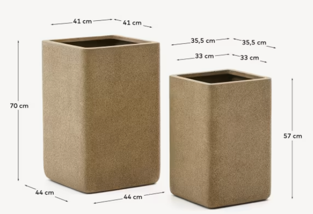 Set hoge plantenpotten Minoa is gemaakt van polycement — een materiaal dat is samengesteld uit hars en steenpoeder, dat een stenen afwerking imiteert en hoge duurzaamheid en lichtheid biedt. Plantenpotten hebben een afvoergat aan de onderkant, wat zorgt voor een goede afvoer van overtollig water. Hun eenvoudige, kubistische vorm en warme afwerking maken ze een veelzijdige aanvulling voor zowel binnen- als buitenruimtes, waardoor de inrichting een moderne en elegante uitstraling krijgt.