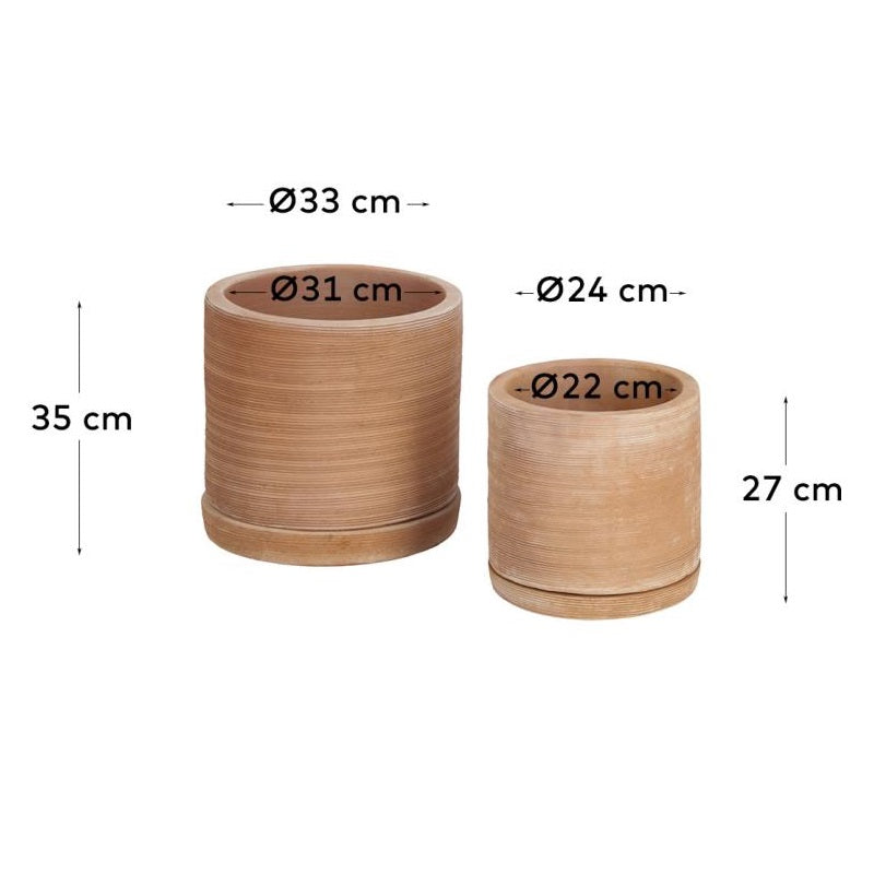Bestel set elegante bloempotten Karlina vandaag nog en zorg voor de veiligheid en gezondheid van uw planten, ongeacht de weersomstandigheden. Dankzij terracotta als uitvoeringsmateriaal, zullen deze potten een duurzame en stijlvolle aanvulling op uw omgeving worden, die het natuurlijke karakter ervan benadrukt.