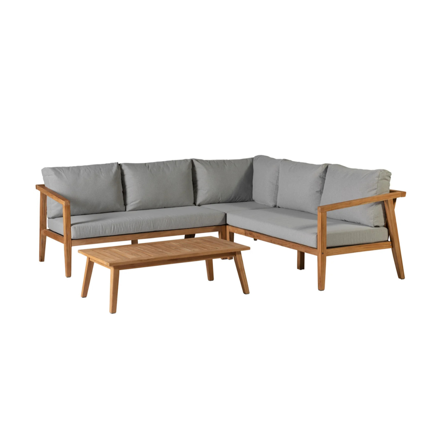 De set bevat een hoekbank, een salontafel en kussens.