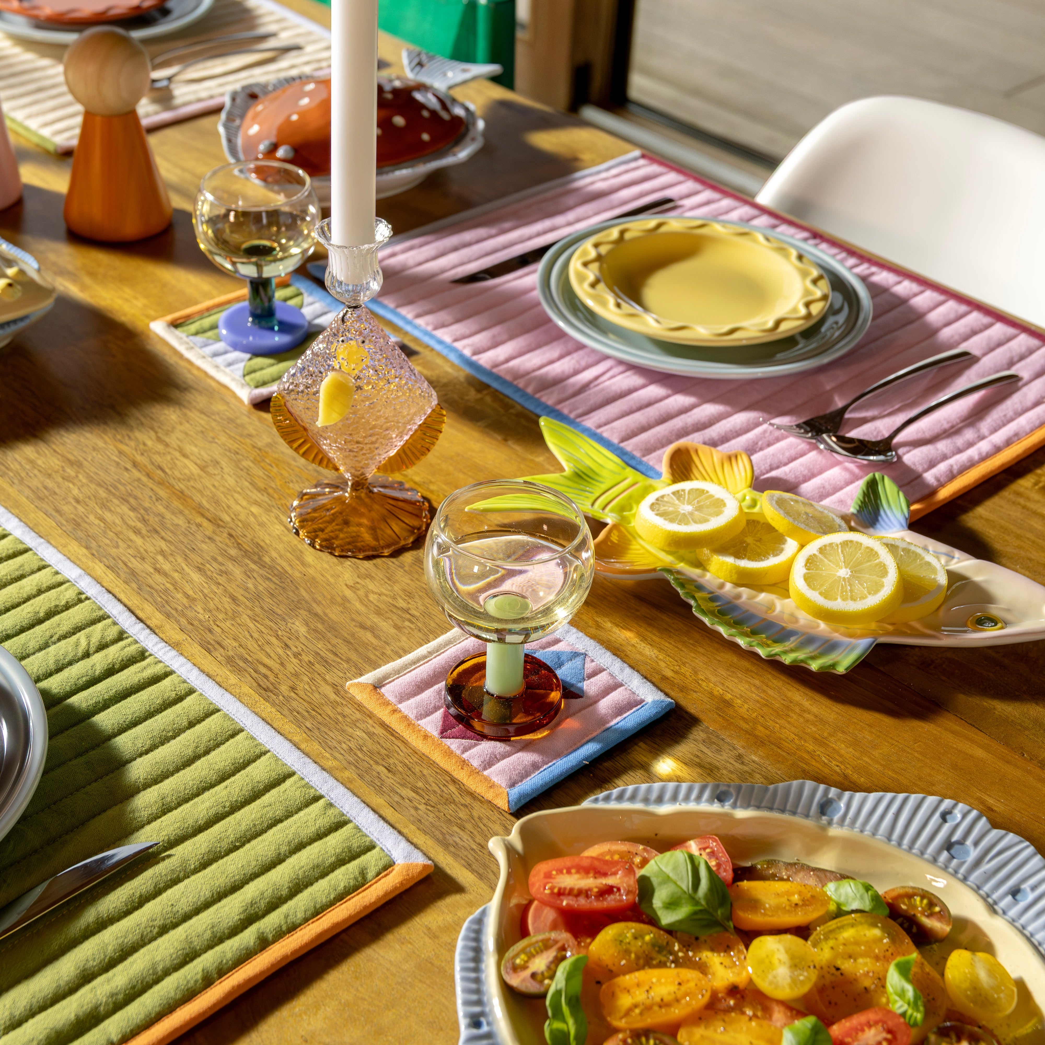 Set van vier onderzetters, valt op door zorgvuldig gekozen kleurcombinaties en een verfijnde afwerking. Deze praktische onderzetters, beschermen niet alleen de tafel tegen hete dranken, maar hebben ook een decoratieve functie, als een stijlvolle aanvulling voor dagelijks gebruik aan tafel.